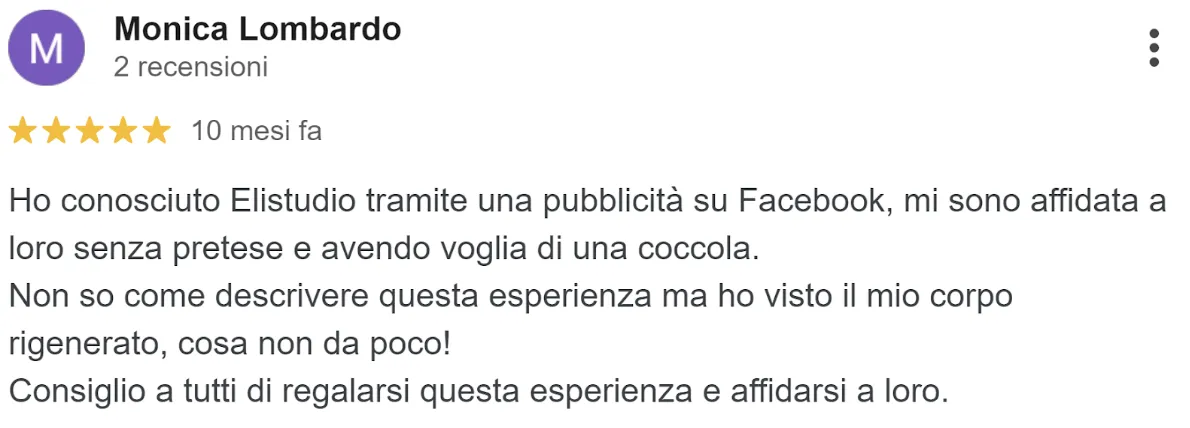 “Non so come descrivere questa esperienza ma ho visto il mio corpo rigenerato, cosa non da poco! Consiglio a tutti di regalarsi questa esperienza”